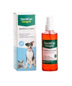 Dentican spray es un dentífrico en spray para mascotas. Con este producto para la higiene de perros y gatos te ahorrarás las luchas interminables con tu mejor amigo al cepillar sus dientes. Su completa fórmula a base de fluoruro de sodio y digluconato de clorhexidina, garantiza una total higiene bucal.