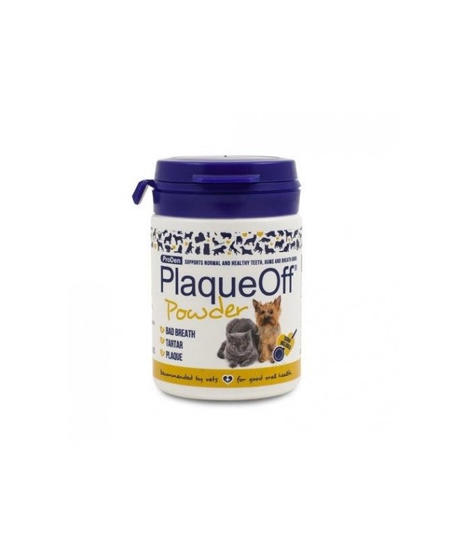 PlaqueOff Polvos antisarro es un producto natural a base de algas marinas para la higiene dental de tu mascota. Este artículo para perros y gatos ayuda a eliminar la placa bacteriana, el sarro y el mal aliento en el animal. Su exclusiva receta, patentada y clínicamente probada, asegura el cuidado de la higiene bucal de tu mejor amigo.
